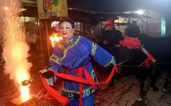 新泉舉行了犁春牛民俗活動(dòng)。七人鳴鑼開(kāi)道,二位童男童女提著“國(guó)泰民安”“風(fēng)調(diào)雨順”吉利燈。牽牛僮牽著用紅綢布扎花披頭的健壯耕牛,后面跟著犁田、送飯、釣魚(yú)、挑柴、抬農(nóng)具、讀書(shū)、擔(dān)牛草、挑谷子及抬松明火等20余人。牽牛僮和犁田扮演者,卷袖、赤腳、戴斗笠,他們邊走邊演,不時(shí)為路邊游客送去新春祝福,并“嘿、嘿”地喝牛犁田,儼然一幅熱鬧的春耕圖。