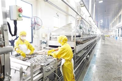 2日,記者來到智能加工車間,香味四溢,防護(hù)服摩擦聲與設(shè)備運(yùn)轉(zhuǎn)聲交織,工人們頭戴面罩、手戴無菌手套,在118米長(zhǎng)的全自動(dòng)生產(chǎn)線前專注作業(yè)。“日本食客喜歡‘入口即化’,歐美市場(chǎng)偏好‘焦脆口感’。全自動(dòng)生產(chǎn)線由精密設(shè)備精準(zhǔn)把控火候,能一鍵切換多種風(fēng)味模式,讓每片鰻魚都裹上均勻的琥珀糖衣?!笨偨?jīng)理胡超選輕敲傳送帶,向記者介紹。