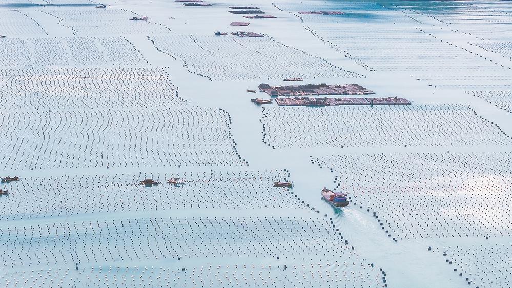 圖為北壁鄉(xiāng)上岐村海域,海面上一排排養(yǎng)殖浮球整齊排列,養(yǎng)殖戶駕駛漁船穿梭其間采收鮑魚。