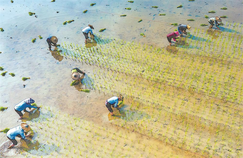 6月5日,在三明市沙縣區(qū)夏茂鎮(zhèn),農(nóng)民們搶抓農(nóng)時(shí),在田間地頭忙著插秧。當(dāng)日是芒種時(shí)節(jié),正是“三夏”農(nóng)忙之際,民間也稱之為“忙種”。沙縣區(qū)夏茂鎮(zhèn)是農(nóng)業(yè)重鎮(zhèn),同時(shí)也是福建省農(nóng)業(yè)科學(xué)院水稻研究所的育種基地及中國(guó)稻種南方研發(fā)展示基地的所在地,全鎮(zhèn)耕地面積4.37萬(wàn)畝,擁有萬(wàn)畝良田,每年穩(wěn)定種植優(yōu)質(zhì)稻、超級(jí)稻2.7萬(wàn)畝,制種8000畝。