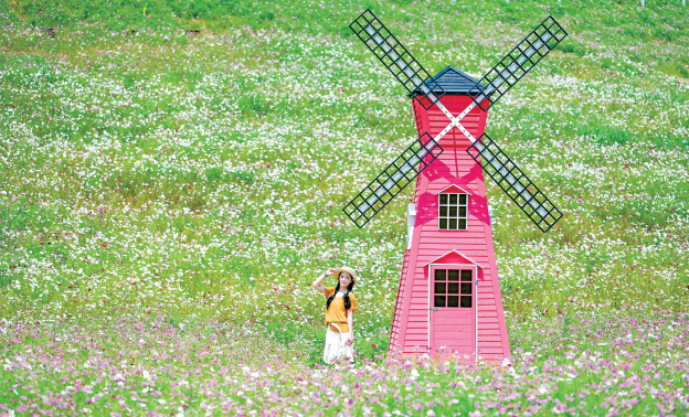 園區(qū)中心位置是荷塘,正值夏日,粉白荷花競相綻放,與碧綠荷葉相映成趣,頗有幾分“接天蓮葉無窮碧,映日荷花別樣紅”的意境。荷塘之上,鐵軌蜿蜒。一列小火車往來穿梭,游客徜徉于一片荷海之中。不遠(yuǎn)處,成片的格?;S風(fēng)搖曳。陽光下,粉白、玫紅的花朵熠熠生輝……