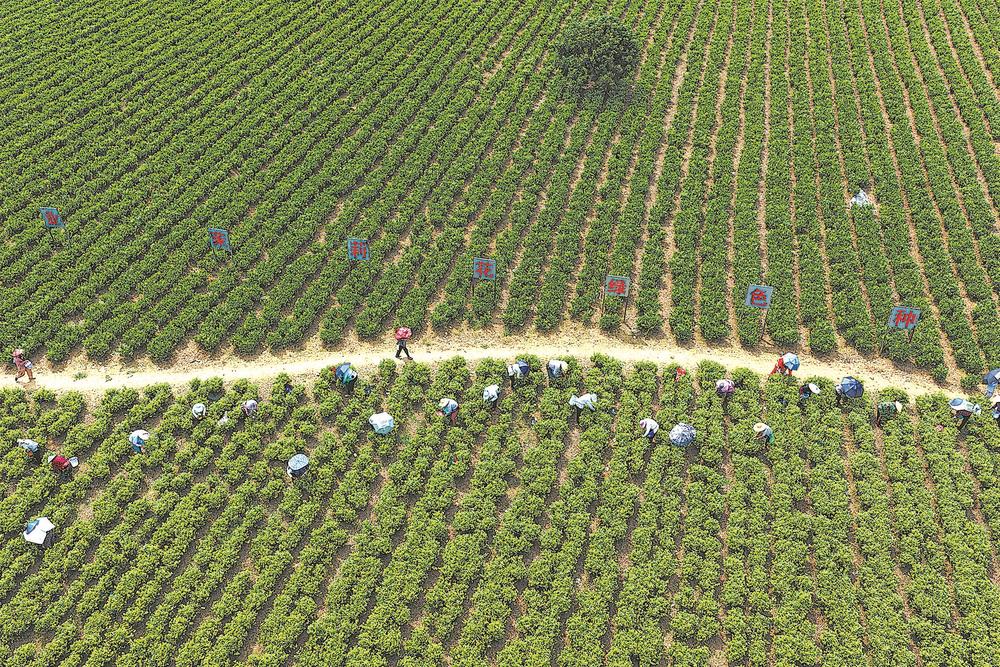 近日,福州市閩侯縣竹岐鄉(xiāng)蘇洋村茉莉花基地,近200畝茉莉花田次第進入采摘期,農民搶抓農時采花、制花茶,供應市場。圖為農民在茉莉花田里采花。