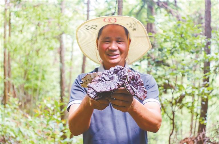 眼下,正值紫靈芝采收高峰。在周寧縣七步鎮(zhèn)后洋村黃振芳家庭林場,工人們穿梭林間,采摘紫靈芝。