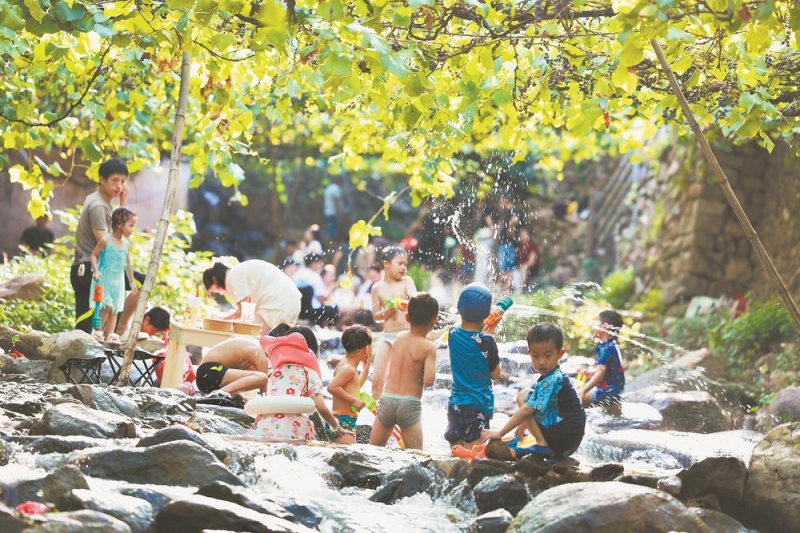初秋時節(jié),走進福安市穆云畬族鄉(xiāng)溪塔村的“中國最美葡萄溝”,刺葡萄正進入采摘季,溝上碩果盈枝,溝下流水潺潺。果農(nóng)忙著采摘、裝運、售賣刺葡萄,游客在此戲水游玩、采摘打卡。據(jù)了解,溪塔村今年種植刺葡萄1300多畝,預(yù)計年產(chǎn)鮮果2000多噸,產(chǎn)值約1600萬元。
