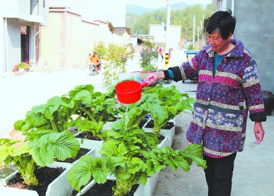 漫步在新橋村,清澈見底的溪水,干凈整潔的巷道,綠意盎然的人家,都令人賞心悅目。來到村民范貞干的門口,一字排開的10多盆綠油油的芥菜吸引了的目光。范貞干邊洗衣服邊說,她家沒空地種菜,只好采用這種辦法,這菜還可以當(dāng)花來欣賞。不由稱贊這個(gè)辦法好——因地制宜,一舉兩得,綠化美化的效果不比盆栽花卉差。