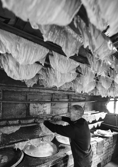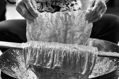 老陸說(shuō),把黃豆磨成漿后,倒入煤爐上的陶鍋中,豆?jié){表層會(huì)慢慢凝結(jié)成皮,“變黃凝結(jié)時(shí)就能挑皮了,大概15—20分鐘才能挑出一層?!崩详戇呎f(shuō)邊用一根銀筷,在豆?jié){表面一挑,一張皮薄透明、色澤乳白微黃的豆皮熱氣騰騰地現(xiàn)身了。帶有湯汁的豆皮挑出后,還要在竹竿上晾干。“晾曬前,所有豆皮得回爐,醮一醮鍋底的漿水,做出來(lái)的豆皮才更有味道!”
