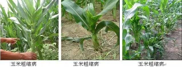粗縮病多在玉米5-6葉時(shí)出現(xiàn),病苗濃綠,節(jié)間縮短,葉片僵直,寬短而厚,植株生長(zhǎng)緩慢、矮化。