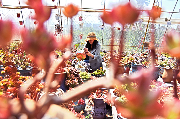 5月18日,在山東省沂源縣歷山街道西北麻村,一名殘疾人電商在為準(zhǔn)備網(wǎng)銷的多肉植物拍照。