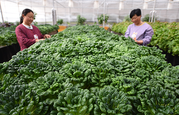 5月21日,農(nóng)民在衡水市桃城區(qū)鄧莊現(xiàn)代農(nóng)業(yè)綜合示范園內(nèi)查看蔬菜的長勢。