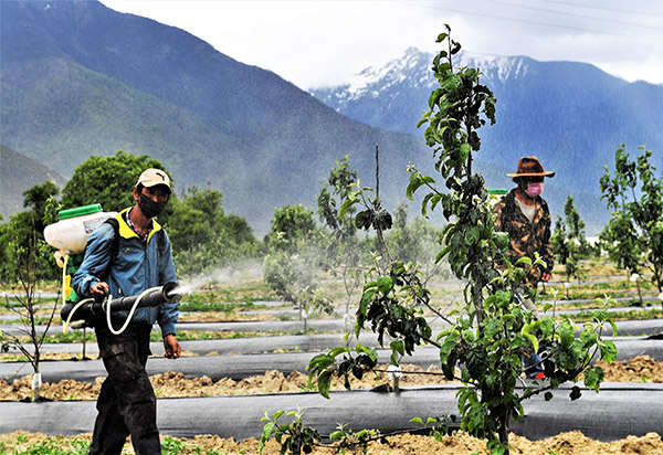 5月22日,米林農(nóng)場職工在第四生產(chǎn)管區(qū)蘋果種植基地噴灑可有效降解的生物農(nóng)藥。
