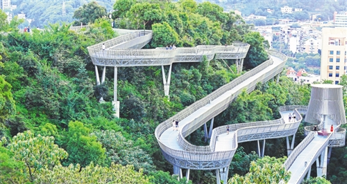 市民和游客在福州市鼓樓區(qū)金牛山體育公園背后森林中的城市休閑綠道上漫步。新華社 林善傳攝