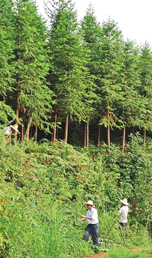 在河南省新縣沙窩鎮(zhèn)汪沖村,村民在清除杉樹林旁的雜草。 新華社 馮大鵬攝