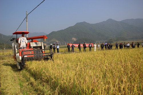 10月24日,在沙縣夏茂鎮(zhèn)松林村舉辦省農(nóng)業(yè)廳“機(jī)收再生稻示范推廣項(xiàng)目”沙縣再生稻全程機(jī)械化輕簡高效栽培示范點(diǎn)現(xiàn)場觀摩與實(shí)割測產(chǎn)驗(yàn)收會,70多位新型經(jīng)營主體和夏茂鎮(zhèn)各村農(nóng)技員,認(rèn)真觀摩了由該村慧農(nóng)種植專業(yè)合作社實(shí)施的503畝頭季低留樁機(jī)收再生稻的田間長勢和產(chǎn)量實(shí)割情況,只見收割機(jī)在田間“轟隆隆”的行走幾圈后,近十七袋金燦燦的稻谷,堆御在路邊,觀摩種糧新型經(jīng)營主體個個喜笑顏開,紛紛表示來年種植機(jī)收再生稻。