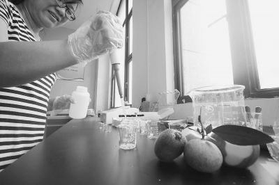 海峽農(nóng)博匯物流城檢測員對果蔬進(jìn)行農(nóng)殘檢測。