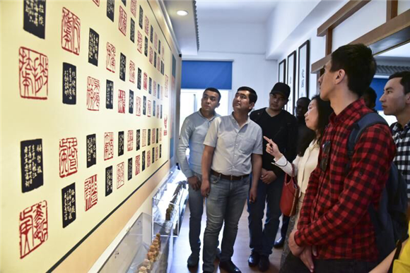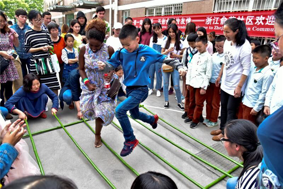 在中國同學(xué)的陪同下,留學(xué)生們參觀了位于社區(qū)文化中心二樓的五彩俞園民族文化館。在民族廳,精美的剪紙、繪畫、書法、篆刻等作品讓他們駐足觀賞、嘖嘖稱贊,而民俗廳里陳列的器物、服裝又讓他們對寧波當(dāng)?shù)氐娘L(fēng)俗產(chǎn)生了濃厚興趣,爭相向志愿者詢問各種問題。留學(xué)生們還躍躍欲試,與鎮(zhèn)海片區(qū)的小學(xué)生們互動,共同參與泥塑制作活動。大家充分發(fā)揮自己的想象,不出半個小時,一幅幅栩栩如生的作品誕生了,留學(xué)生們還紛紛和在場的小朋友互相欣賞和介紹自己的作品,或拿出手機拍下自己的大作。意猶未盡之余,大家來到戶外,一起玩起了踢毽子、竹竿舞、動感顛球等中國傳統(tǒng)文體活動。來自孟加拉的留學(xué)生Sabbir和烏茲別克斯坦的Lieonsa表示,這樣的活動有意思,中華文化魅力無窮。