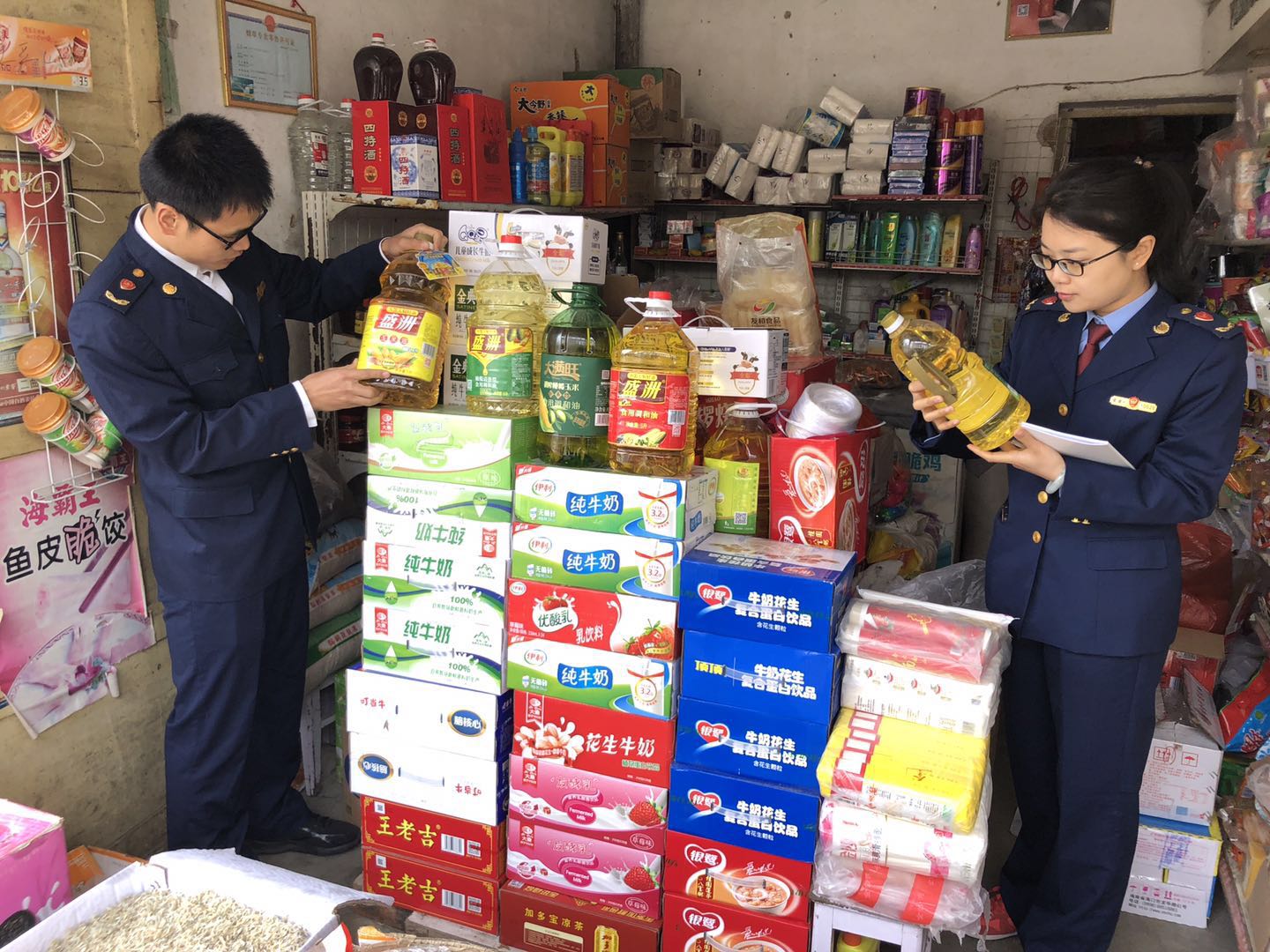 ?。▓?zhí)法人員正在對(duì)食雜店的食用油外包裝標(biāo)識(shí)進(jìn)行檢查)