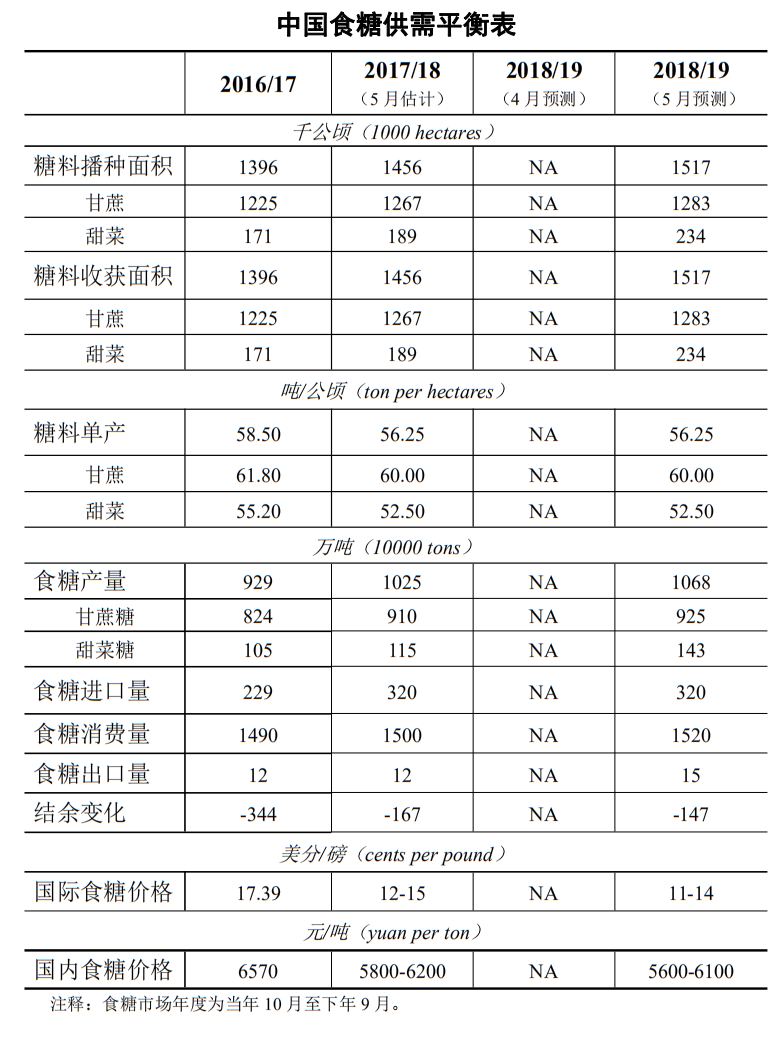 本月預(yù)測,2018/19年度中國糖料播種面積1517千公頃,較2017/18年度增加61千公頃,增幅4.2%。糖料播種面積增加的主要原因是主產(chǎn)區(qū)糖料收購價格較高,糖農(nóng)種植積極性提升。糖料入榨量和食糖產(chǎn)量預(yù)期增加,2018/19年度中國食糖產(chǎn)量1068萬噸,較2017/18年度增加43萬噸,增幅4.2%。2018/19年度中國食糖進(jìn)口量320萬噸,與2017/18年度持平;食糖出口量15萬噸,較2017/18年度增加3萬噸,主要是由于轉(zhuǎn)口貿(mào)易增加。2018/19年度中國食糖消費(fèi)量1520萬噸,較2017/18年度增加20萬噸,原因在于預(yù)期食糖價格下行,有助于提振食糖消費(fèi)。2018/19年度國際食糖均價每磅11-14美分,均值較2017/18年度降低1美分,主要是世界食糖主產(chǎn)國產(chǎn)量增加,國際食糖市場供給過剩的局面仍將持續(xù)。受此影響,2018/19年度國內(nèi)食糖均價在每噸5600-6100元,均值較2017/18年度降低150元。