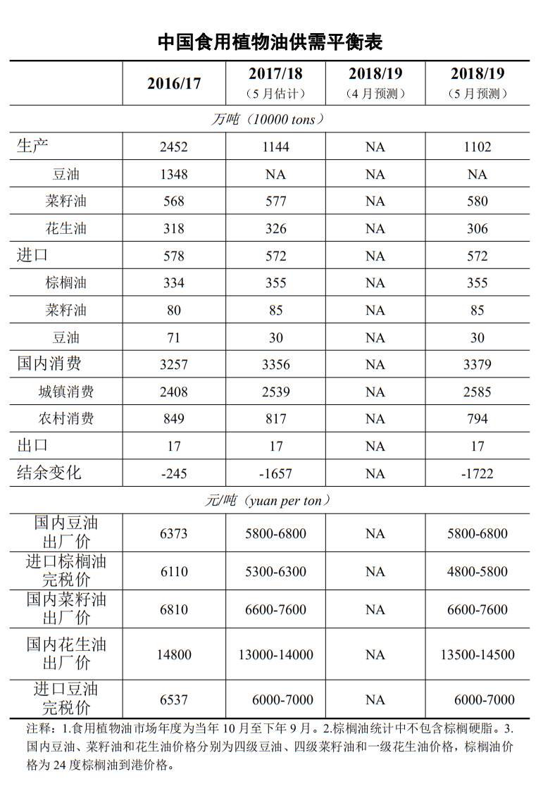 本月預(yù)測,2018/19年度,中國食用植物油產(chǎn)量2779萬噸,較上年度減少14萬噸。其中,因大豆壓榨量較上年度增加,豆油產(chǎn)量較上年度增加2萬噸,達(dá)1652萬噸;菜籽油產(chǎn)量589萬噸,較上年度增加12萬噸,主要是因為油菜種植效益恢復(fù),意向播種面積增加,同時中加貿(mào)易關(guān)系相對穩(wěn)定,有利于油菜籽進(jìn)口增加?;ㄉ彤a(chǎn)量306萬噸,較上年度減少20萬噸,主要是因為花生種植比較效益下滑,意向播種面積較上年度明顯減少;棉籽油等其他植物油較上年度減少8萬噸。食用植物油進(jìn)口量572萬噸,與上年度持平。國內(nèi)消費(fèi)量3379萬噸,較上年度增加23萬噸,主要因為全國人口總量和城鎮(zhèn)化水平均預(yù)期進(jìn)一步提升。
