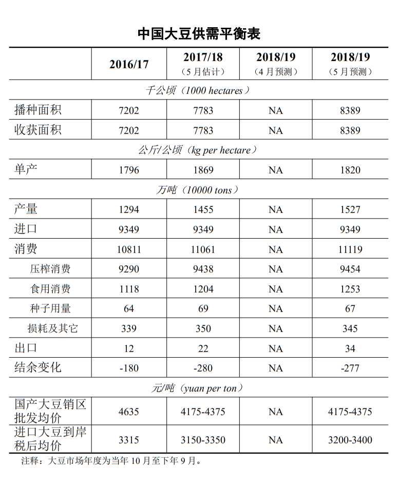 本月預(yù)測,2018/19年度,在大豆主產(chǎn)區(qū)輪作休耕補(bǔ)貼政策和東北產(chǎn)區(qū)大豆生產(chǎn)者補(bǔ)貼政策推動下,中國大豆播種面積預(yù)計繼續(xù)增加,達(dá)到8389千公頃,比上年度增加7.8%;目前東北地區(qū)大豆已開播,預(yù)計5月份內(nèi)蒙古東部、東北地區(qū)大部降水量較常年偏少,全國平均單產(chǎn)將低于上年;大豆總產(chǎn)量1527萬噸,比上年度增加4.9%;受國內(nèi)大豆繼續(xù)增產(chǎn)、大豆需求增速放緩等因素影響,預(yù)計大豆進(jìn)口量9565萬噸,比上年度減少0.3%;國內(nèi)畜禽養(yǎng)殖業(yè)發(fā)展仍將拉動飼料原料消費(fèi)量增加,但生豬養(yǎng)殖利潤下滑將促使蛋白飼料添加比例回調(diào),預(yù)計國內(nèi)豆粕需求增速將放緩,大豆壓榨消費(fèi)量9454萬噸,比上年度增加0.2%;大豆食用消費(fèi)量1253萬噸,比上年度增加4.1%。在全球大豆需求的拉動下,國際大豆價格仍將延續(xù)底部抬升態(tài)勢,預(yù)計2018/19年度進(jìn)口大豆到岸稅后中間價區(qū)間為每噸3200-3400元,比上年度抬升50元;國產(chǎn)大豆銷區(qū)批發(fā)均價區(qū)間為每噸4175-4375元。