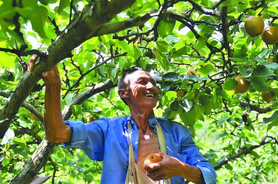 “說起來,我們現(xiàn)在全家人都是靠德化梨找致富路呢?!苯衲?7歲的張金楷老人指著身后碩果累累的梨樹說道。