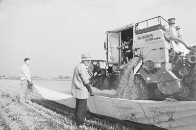 圖為山東鄆城縣農(nóng)機(jī)合作社為農(nóng)民提供麥?zhǔn)胀泄芊?wù)。本報(bào)呂兵兵李慧斌
