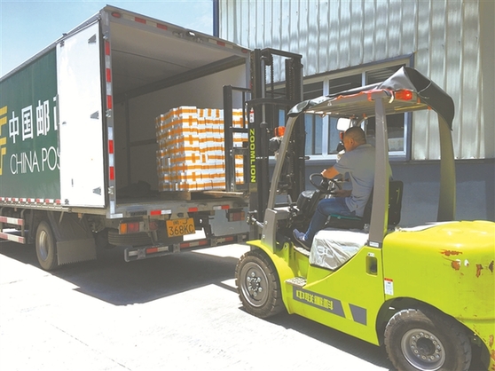鏟車工人將包裝好的辣椒醬產(chǎn)品裝上貨車。