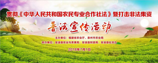 新修訂的《中華人民共和國農(nóng)民專業(yè)合作社法》于2018年7月1日起正式實施,為貫徹落實新合作社法,7月1日,安溪縣貫徹《中華人民共和國農(nóng)民專業(yè)合作社法》暨打擊非法集資普法宣傳活動在茶都廣場順利舉辦。此次活動由福建省農(nóng)業(yè)廳、泉州市農(nóng)業(yè)局主辦,安溪縣農(nóng)業(yè)與茶果局、縣財政局和縣處非辦承辦。