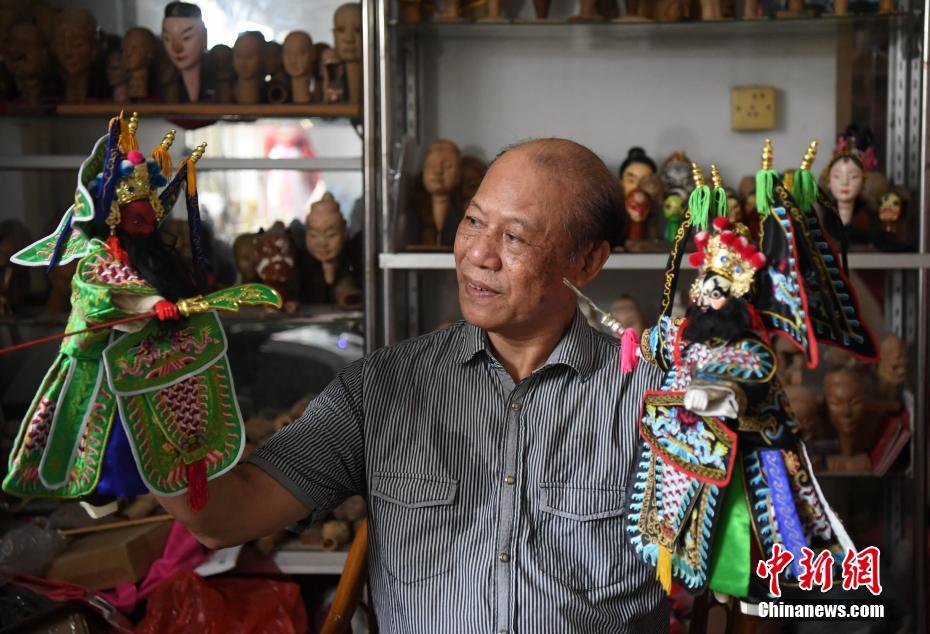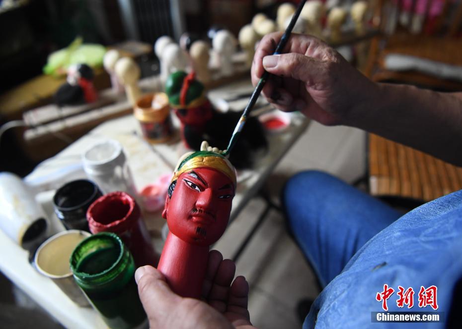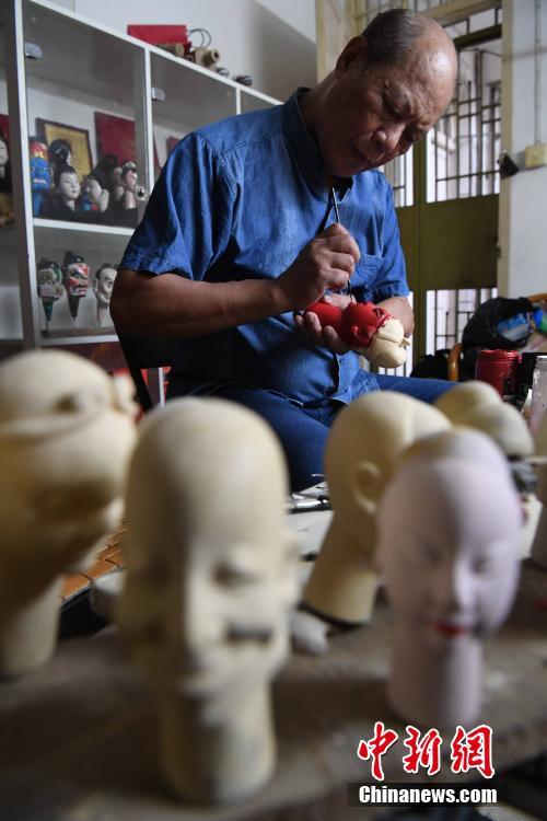 圖為楊亞州在其工作室為雕刻的木偶頭上色。楊亞州的祖父楊高金為清末“福春派”戲狀元,到了楊亞州這一代,他鉆研木偶雕刻,姐姐為他的木偶當(dāng)裁縫,其弟楊輝發(fā)揚(yáng)木偶戲表演技藝。張斌 攝