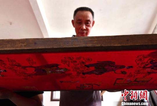 他與妻子在村中開辦了一家刺繡家庭作坊,制作壽序、龍傘、迎神旗等民俗活動類刺繡用品。呂明 攝 呂明 攝