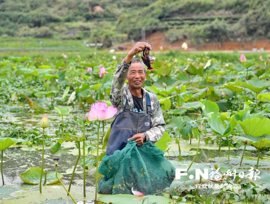 羅源縣中房鎮(zhèn)滿盾村,一條清澈的溪流兩旁,碧綠的荷花田一望無際。朱師傅正從荷花田中撈出一只只碩大鮮活的小龍蝦,豐收的喜悅寫在他的臉上。