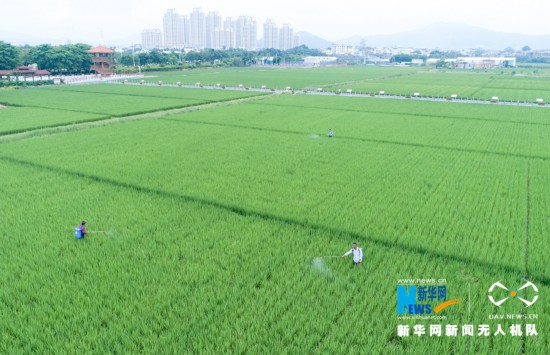 單季稻長得綠油油,幾位農(nóng)民正在田中噴藥除蟲害。