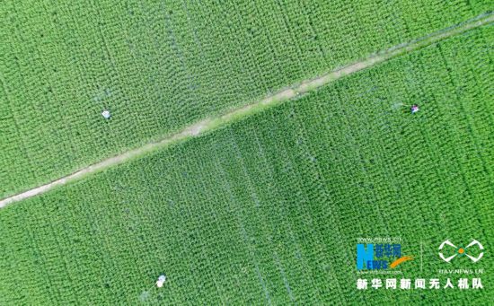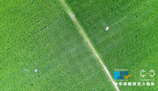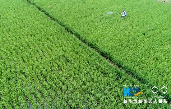 花田里的水稻長勢喜人,兩名農(nóng)民正在田中噴藥除蟲害。