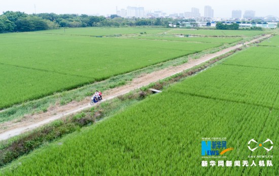 傍晚,市民騎車帶上孩子,在田埂里慢行,感受生態(tài)田園美景。