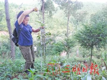 明溪縣在針葉林下套種鄂西紅豆樹(shù),一年生幼樹(shù)平均高度達(dá)到一點(diǎn)五三米,地徑二點(diǎn)六厘米,成活率百分之九十九點(diǎn)六。經(jīng)中國(guó)林業(yè)科學(xué)研究院亞熱帶林業(yè)研究所專家確認(rèn),這一林下套種鄂西紅豆樹(shù)技術(shù),在全國(guó)處于領(lǐng)先地位。這片幼林位于明溪縣東部,為南方紅豆杉與鄂西紅豆樹(shù)混交種子園,其中鄂西紅豆樹(shù)四十一個(gè)家系,總面積一百零五畝,由全國(guó)科普帶頭人余能健負(fù)責(zé)技術(shù)攻關(guān)和指導(dǎo)。據(jù)余能健介紹,鄂西紅豆樹(shù)是紅豆樹(shù)的一個(gè)珍稀品種,同為豆科常綠喬木,干形通直,木材堅(jiān)硬,紋理細(xì)致,心材耐腐,素有“中國(guó)桃花心木”之美譽(yù),被列入國(guó)家二級(jí)重點(diǎn)保護(hù)植物。圖為八月十五日,科研人員在測(cè)量鄂西紅豆樹(shù)生長(zhǎng)情況。