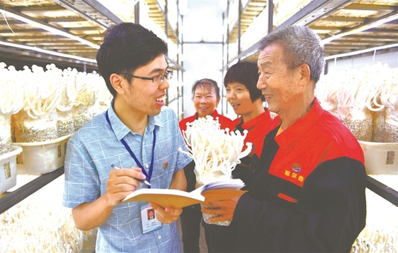 8月23日,古田縣鳳埔鄉(xiāng)紀(jì)委掛鉤幫扶干部黃東華(左一)與貧困戶(hù)陳宗城(右一)交流海鮮菇的種植技術(shù)。陳宗城是古田縣鳳埔鄉(xiāng)的精準(zhǔn)扶貧對(duì)象,目前在工廠(chǎng)里打工,2017年已實(shí)現(xiàn)脫貧,2018年預(yù)計(jì)純收入三萬(wàn)元左右。
