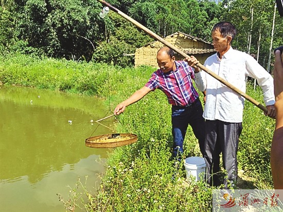 9月10日,在位于度尾鎮(zhèn)后埔村的龍來樂農(nóng)業(yè)開發(fā)有限公司淡水龍蝦養(yǎng)殖場(chǎng)看到,各個(gè)養(yǎng)殖池水域周邊都圍上了護(hù)欄,池后的山上綠草如茵、綠樹成蔭,公司總經(jīng)理林國良正和工人一起給龍蝦喂食豌豆(如圖),發(fā)現(xiàn)這些澳洲淡水龍蝦蝦體呈褐綠色,個(gè)頭較普通小龍蝦大。