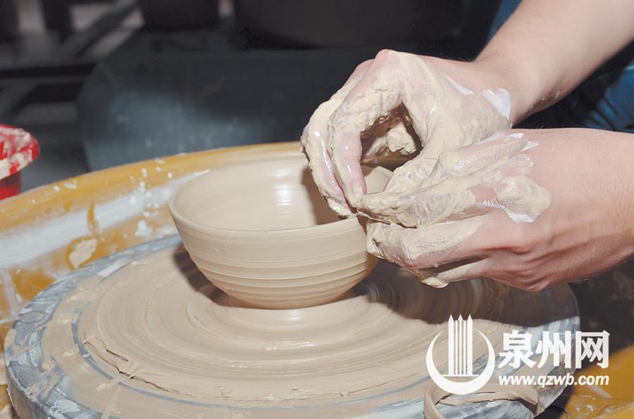 手拉坯,泥土在指尖轉(zhuǎn)動(dòng)成型。