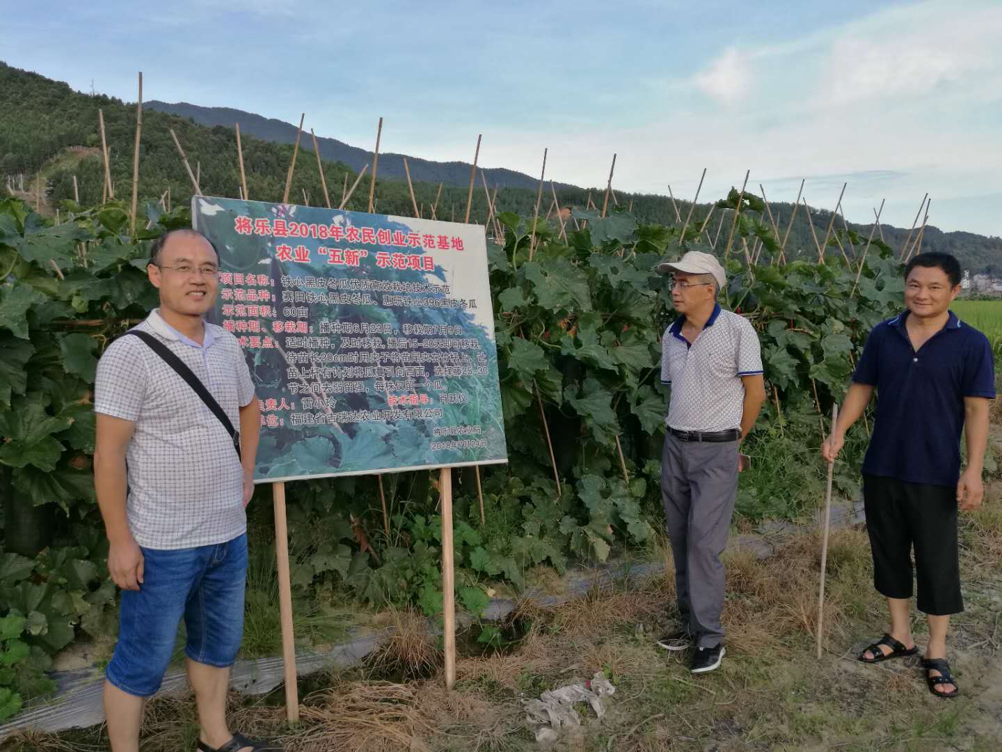 在光明鄉(xiāng)永吉村田頭,一片綠油油肥壯的滕蔓下,豎立著一排排碩大的冬瓜,遠(yuǎn)遠(yuǎn)望去猶如站崗的綠色哨兵,直立挺拔。這就是:福建省吉瑞農(nóng)業(yè)開發(fā)有限公司承擔(dān)的2018年將樂縣農(nóng)民創(chuàng)業(yè)示范基地農(nóng)業(yè)“五新”示范項(xiàng)目,示范栽培的60畝鐵心黑皮冬瓜,長勢喜人,豐收在望,預(yù)計(jì)畝產(chǎn)可達(dá)1萬多公斤,示范片主要栽培技術(shù)是采用以有機(jī)肥為主的測土配方施肥,改傳統(tǒng)小棚載為插雙排竹竿畦載新技術(shù)。為了確保豐收,9月20日,農(nóng)技站和土肥站技術(shù)員到基地指導(dǎo)后期冬瓜水肥田管和病蟲害防治。