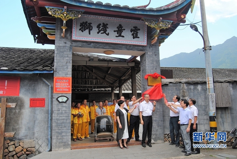 霍童溪流域沿線鄉(xiāng)鎮(zhèn)的42項美食名產(chǎn)、特技特藝、風(fēng)景名勝獲頒“福建方志特色記憶”牌匾。圖為霍童線獅館掛上了“福建方志特色記憶”牌匾。 新華網(wǎng) 劉豐 攝