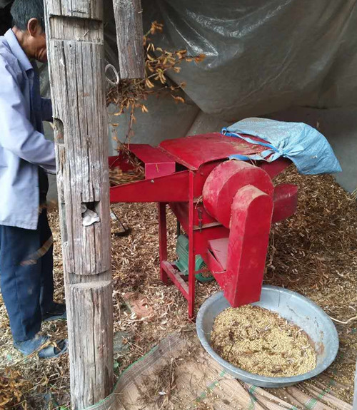 近日,在上青鄉(xiāng)江邊村,村民老嚴(yán)在自家的老房子里,用經(jīng)過技術(shù)改裝后的收割機(jī),正在為村民們“收割”曬干的黃豆。
