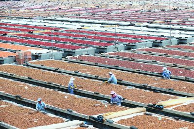 天喔(福建)食品有限公司迎來曬果季,工人們?cè)谔烊涣罆駡?chǎng)里晾曬桃子、李子、青梅等果實(shí),為生產(chǎn)出優(yōu)質(zhì)果脯做準(zhǔn)備。 該公司是“省級(jí)重點(diǎn)龍頭企業(yè)”,加工帶動(dòng)能力強(qiáng),每年僅從全省各地收購的鮮果就達(dá)1.5萬噸左右,帶動(dòng)大量果農(nóng)增收致富。 周明太 林劍冰 陳峰 攝