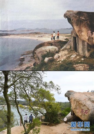 拼版照片,上圖為20世紀(jì)50年代的東山縣東門嶼鷹嘴巖附近風(fēng)貌(資料照片),下圖為2018年10月17日拍攝的東門嶼鷹嘴巖附近風(fēng)貌(新華社姜克紅攝)。