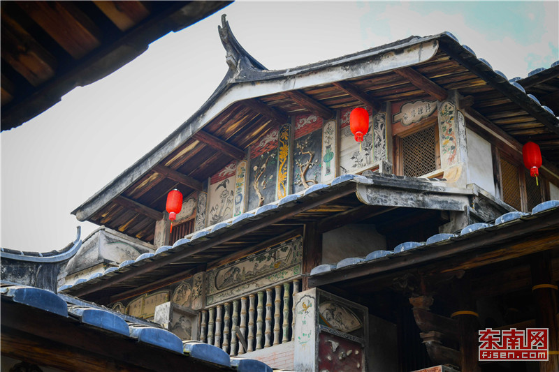 大厝里雕梁畫棟,豐富的藝術裝飾同樣為人稱道。窗欞上八仙獻壽、麒麟送子、仕女稚童等窗花,形神兼?zhèn)洌簧綁土杭苌系窨听堷P、蝙蝠、花卉等圖案,栩栩如生;墻楣、檐下、擋濺墻等細微處,采用精工煙琢墨技法描繪的壁畫,依然色彩鮮艷。