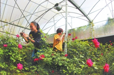 游客在玫瑰農(nóng)莊參加賞花科普活動。