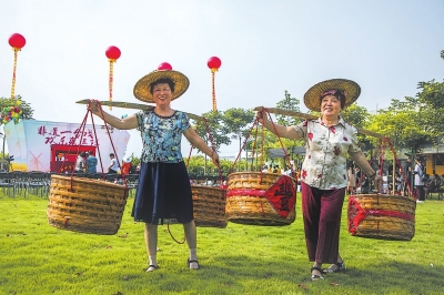 游客在綠港園生態(tài)農(nóng)場體驗農(nóng)民挑擔(dān)子。