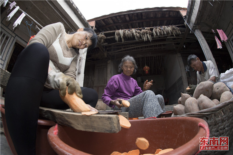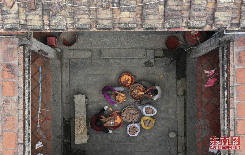 在自家的庭院里,農(nóng)戶在對地瓜進(jìn)行切片加工。 福建日報(bào) 王毅 陳鑫煒 黃瑜鵬 攝
