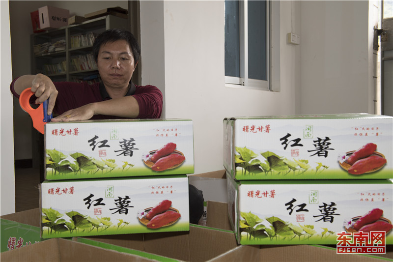 在曙光甘薯合作社里,社員正在將要寄送出去的地瓜打包,裝入印有統(tǒng)一商標(biāo)的箱子。 福建日報(bào) 王毅 陳鑫煒 黃瑜鵬 攝