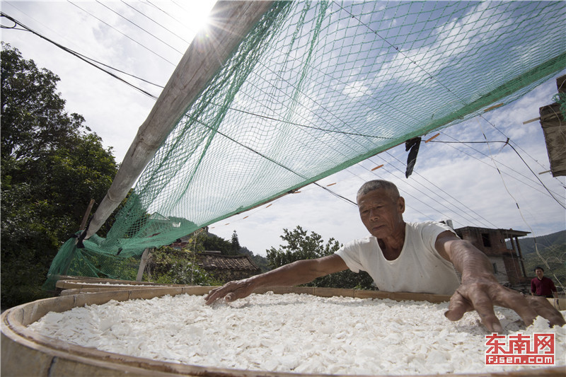 天氣晴朗時(shí),曙光村幾乎每家每戶都會(huì)在門前曬地瓜粉。 福建日報(bào) 王毅 陳鑫煒 黃瑜鵬 攝