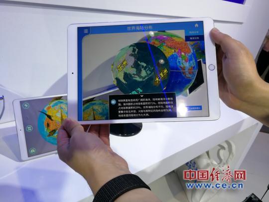 在線教育作業(yè)幫通過AR演示地理教學(xué),氣象現(xiàn)象、水文環(huán)境、宇宙行星等相關(guān)內(nèi)容經(jīng)現(xiàn)實(shí)增強(qiáng)后展現(xiàn)出來,極具趣味性和震撼力。楊秀峰/攝