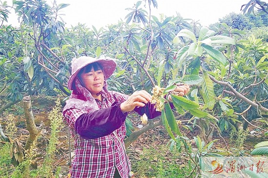 “種枇杷挺麻煩,1年得花6個(gè)月在枇杷樹上,除了日常的澆水、施肥,為保證果實(shí)的營養(yǎng),要把一大串枇杷花捻掉;等到果實(shí)有手指頭大小了,再用紙袋套住幼果,防止蟲叮鳥咬。”在枇杷樹下,洪玉煙一邊熟練地給枇杷捻花,一邊介紹枇杷從種植到采摘過程做的細(xì)活。她告訴筆者,等到枇杷成熟還必須每天把所有果套檢查一遍,才能找到那些成熟的枇杷。這5畝枇杷樹就像是自己的孩子,她幾乎每天都要來看一看,隨時(shí)掌握它們的動(dòng)態(tài)。